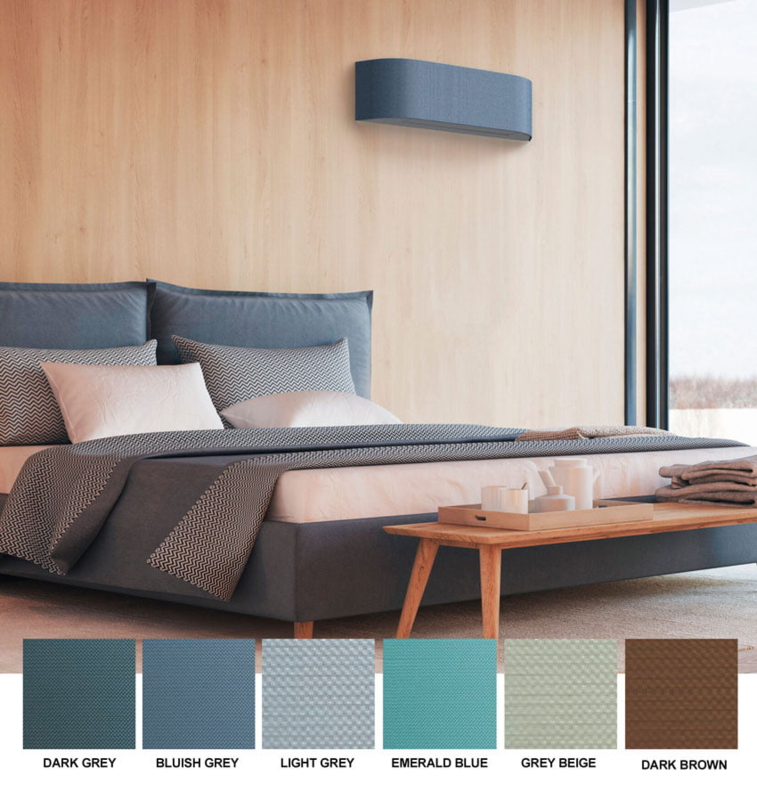 Een TOSHIBA Haori beschikt over een verwisselbare stoffen hoes die de cover van de airconditioner bedekt. Middels een eenvoudig systeem kun je deze aanpassen wanneer jij wilt. Wat past bij jouw interieur. Je kunt een van de 2 standaard hoezen (licht- en donkergrijs) of een van de 6 optionele kleuren (beige, chocoladebruin, zeegroen, blauwgrijs, okergeel of zwart) kiezen. Óf een hoes zelf op maat maken, maar dat kun je ook láten doen. In elke kleur, stof en print.